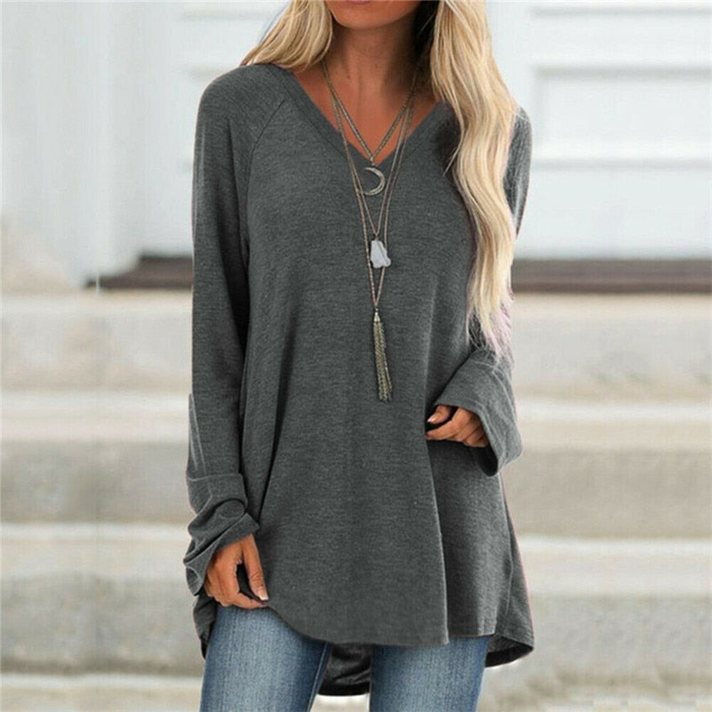 Brand Name: NoneMaterial: PolyesterSleeve Length(cm): FullSleeve Style: REGULARFabric Type: BroadclothPattern Type: SolidModel Number: T-shirtClothing Length: LongDecoration: NONEStyle: CasualCollar: V-Neck